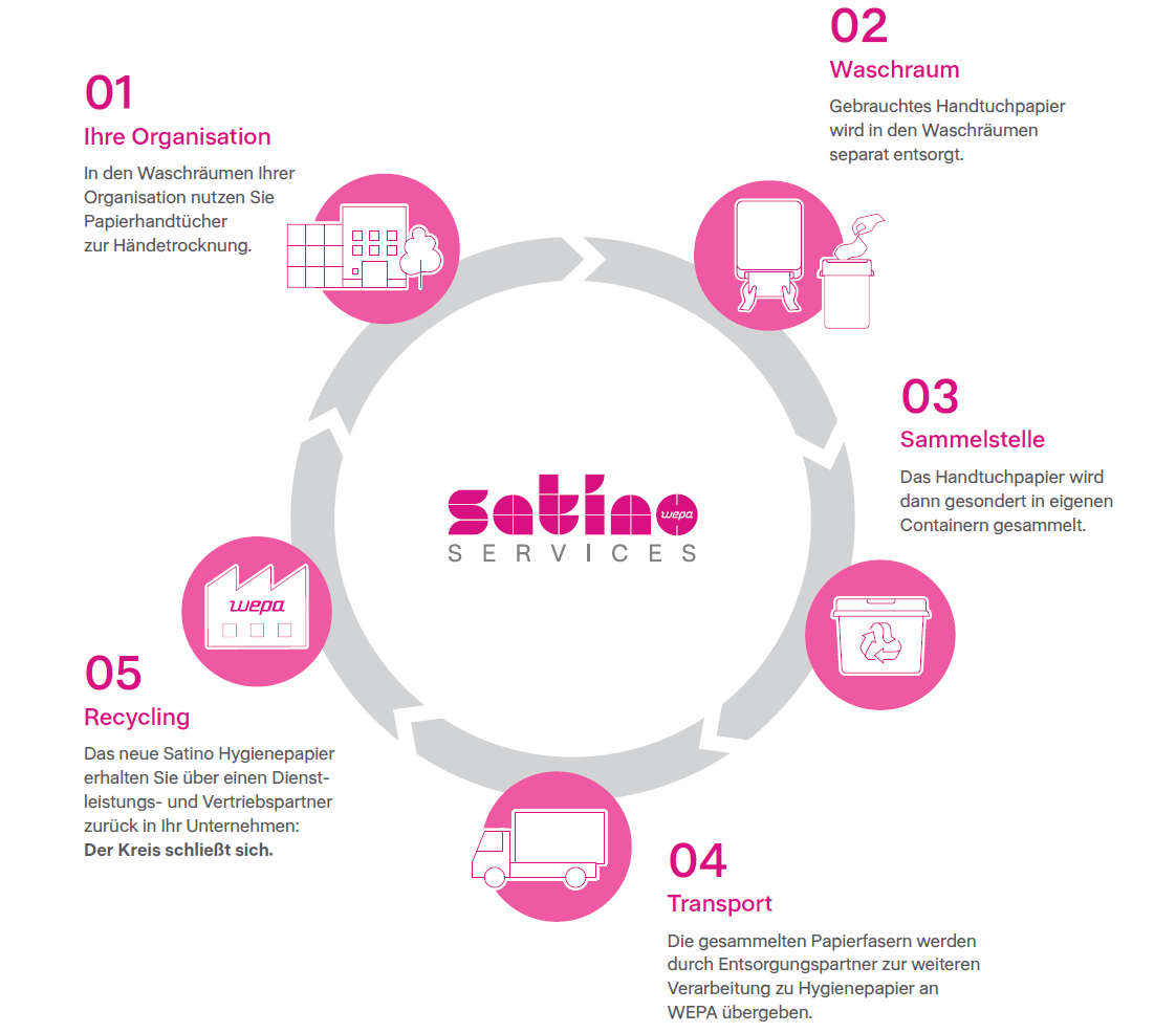 Ein echtes Alleinstellungsmerkmal ist die Satino Papierrückholung: Gebrauchte Papierhandtücher werden wieder zu neuem Hygienepapier verarbeitet – für echte Kreislaufwirtschaft, messbar weniger Abfall und ein nachhaltiges Hygieneerlebnis.